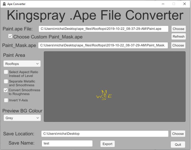 Finally, you’ll need to select a location to save the exported files to. The converter will produce 2 or 4 files (depending on if the “Sepearate Metallic and Smoothness” option is checked) so you need to choose the folder and file name separately. You can use the “Choose” button next to the “Save Location” field to choose a folder, or type it in yourself. Then you need to type a name into the “Save Name” field. This name will be used to prefix the file names on the exported files. For instance, if you enter “monkey” as the Save Name, the output files will be “monkey_Paint.png” and “monkey_Mask.png” .
